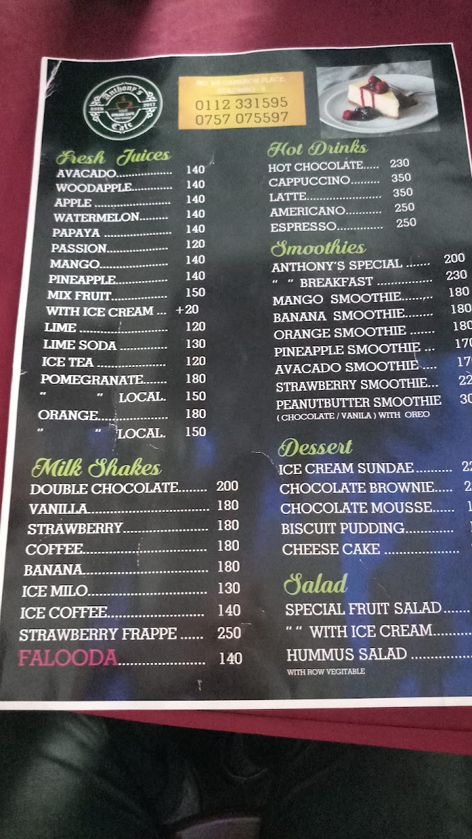 Welcome to Anthony's Cafe, a cozy gem nestled in the heart of Colombo. This delightful spot is perfect for coffee lovers and dessert enthusiasts alike, offering an array of delicious options to satisfy your cravings.